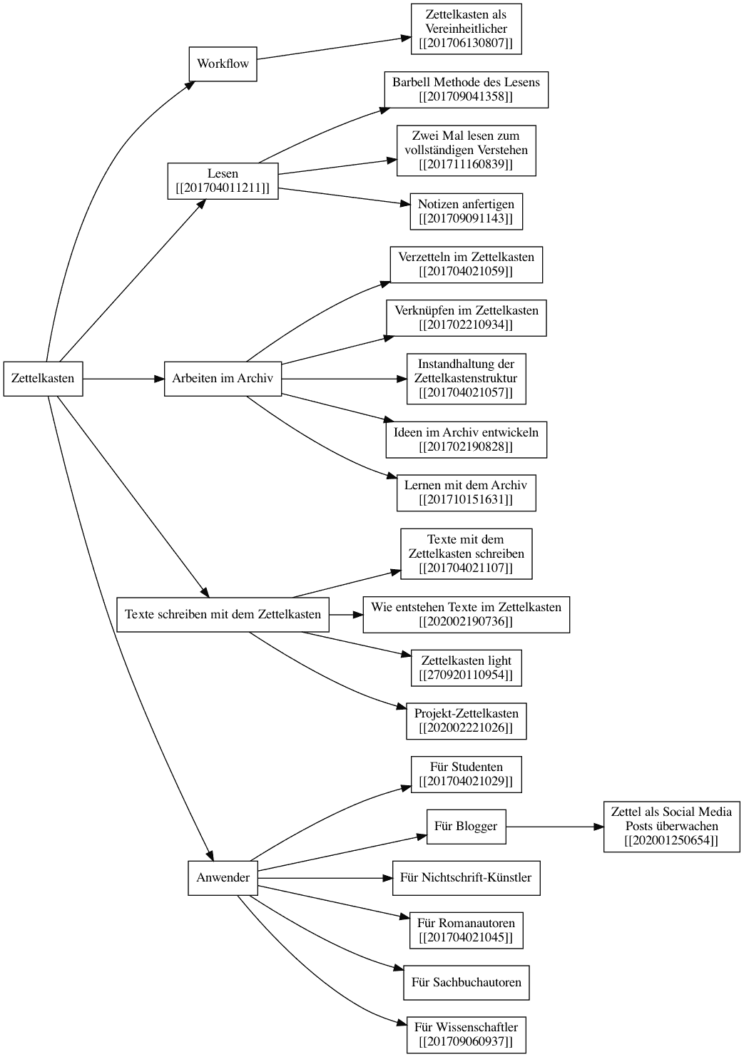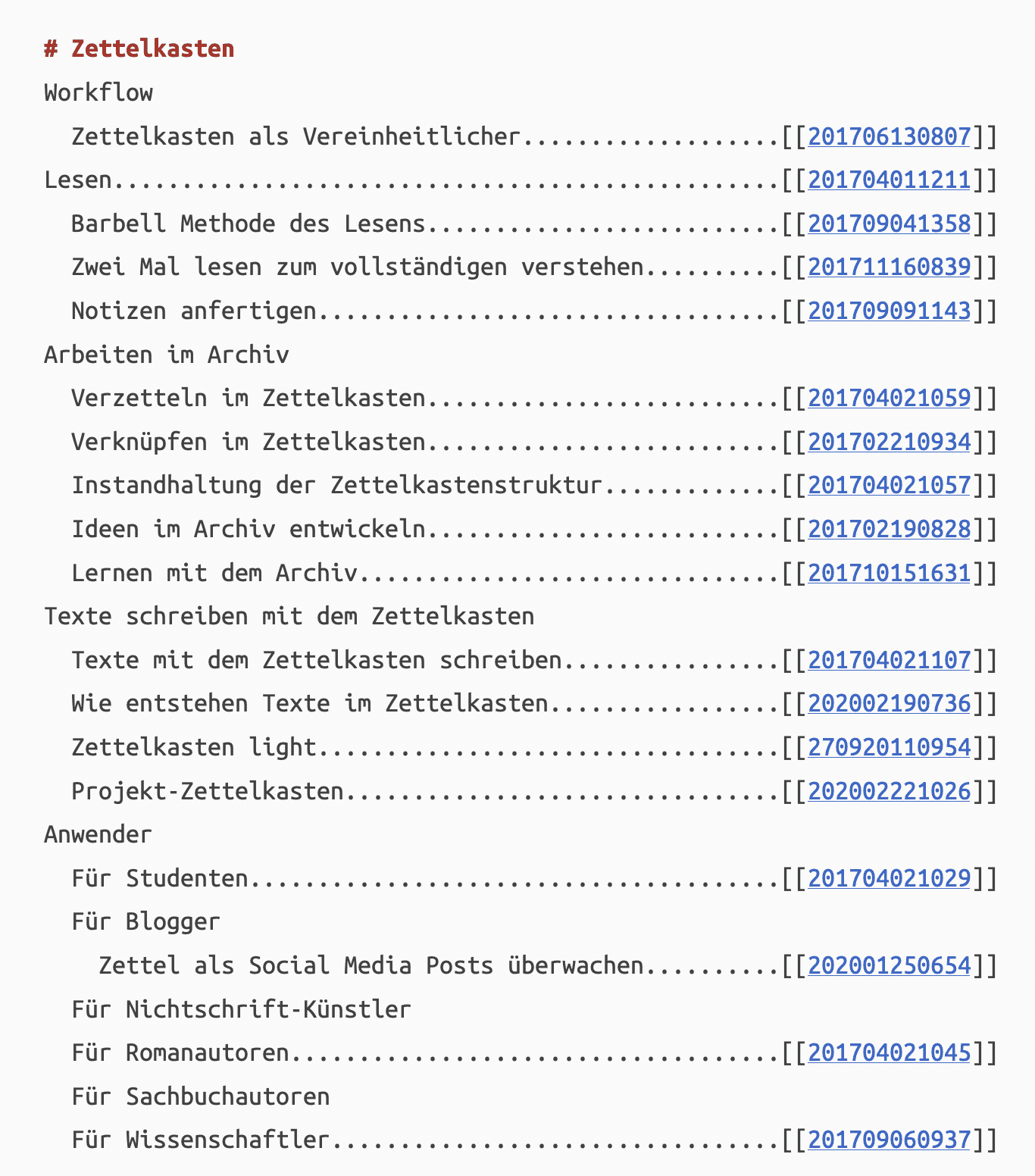 A Structure Note is a Meta-Note: it is a Zettel about other Zettels and their relationships. Luhmann’s hub notes served as fast tracks to navigate through the web of notes. The same is true for Structure Note. For example, I have a Structure Note about The Zettelkasten Method. It is similar to a table of contents specifically made of all my Zettel on the topic. Whenever I write a new Zettel on the Zettelkasten Method, I make sure that I place a link to it on this Structure Note, or on a Structure Note that is itself referred to by the main Structure Note on the Zettelkasten Method.