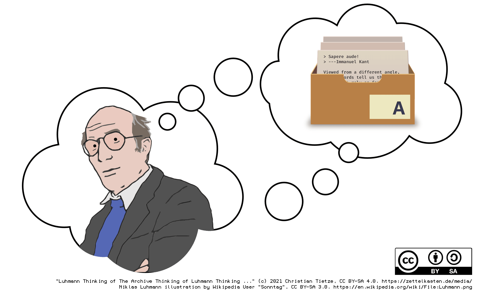 The illustrated Luhmann picture is originally from https://en.wikipedia.org/wiki/File:Luhmann.png, made by Wikipedia user “Sonntag” in 2008, published under the CC BY-SA 3.0 Unported license.