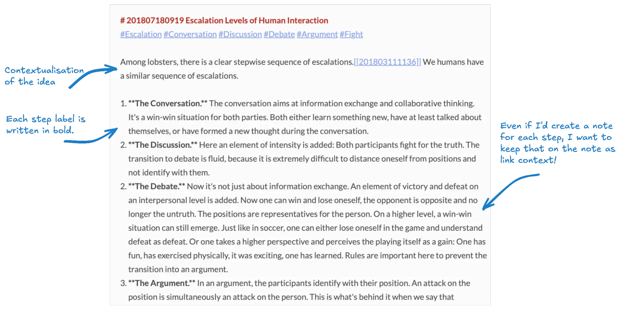 In her breakdown, Morgan puts a heavy emphasis on one direction: Reduction. This is why the following two heuristics in her video are “shortness” and “the inability to cut anything.” This is natural, since the point of reference is her lecture notes. She describes the process of breaking down long notes with a lot of ideas into atomic notes. In relation to lecture notes, an atomic note is indeed short. Compared to a note scribbled in a book’s margin, an atomic note is longer. The shortness of the note is a relative quality. So, you can’t absolutely say that a Zettelkasten note is either short or long. It depends on your point of reference.
