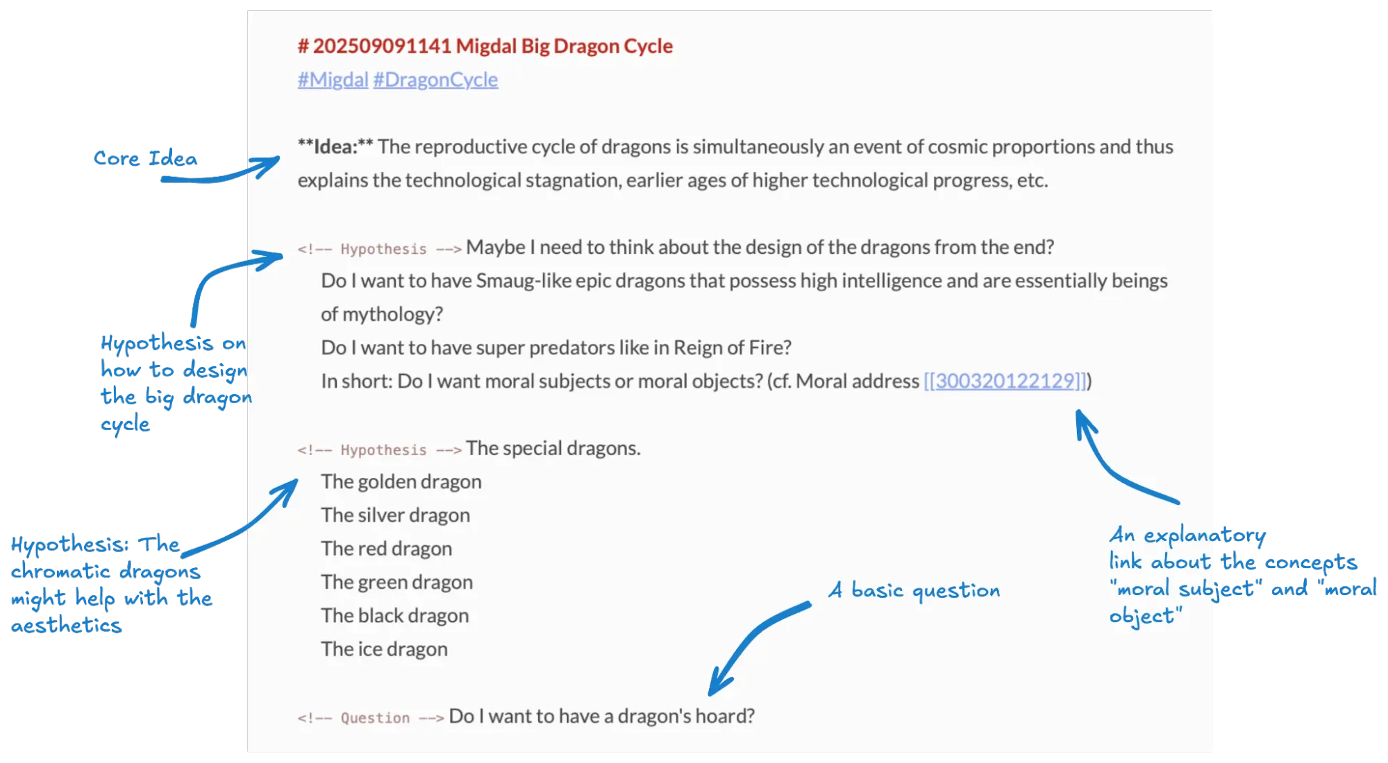 If you use object tags (highly recommended), you have to figure out what the most essential concepts of the idea are. In a way, you delve into the subatomic level and identify the critical components of the idea. Another self-reinforcing feedback loop is now helping you to improve the idea.4