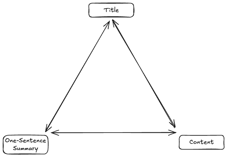 Often, working on the title is a back-and-forth between editing the title and the note. You come up with a title that gives you a different perspective, so you edit the note’s content, which necessitates a better title, and so on. A feedback loop of self-reinforcing idea improvement is established.
