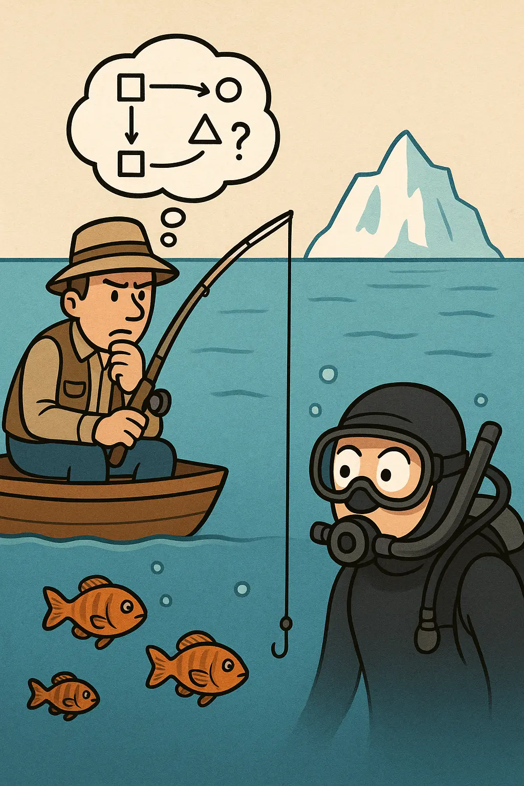 The fisherman has very efficient heuristics about what is happening in the water. A scuba diver can go in there and see for himself. The scuba diver has a much clearer picture of what is going on because he is in direct contact with the object of interest, rather than interacting with a black box.