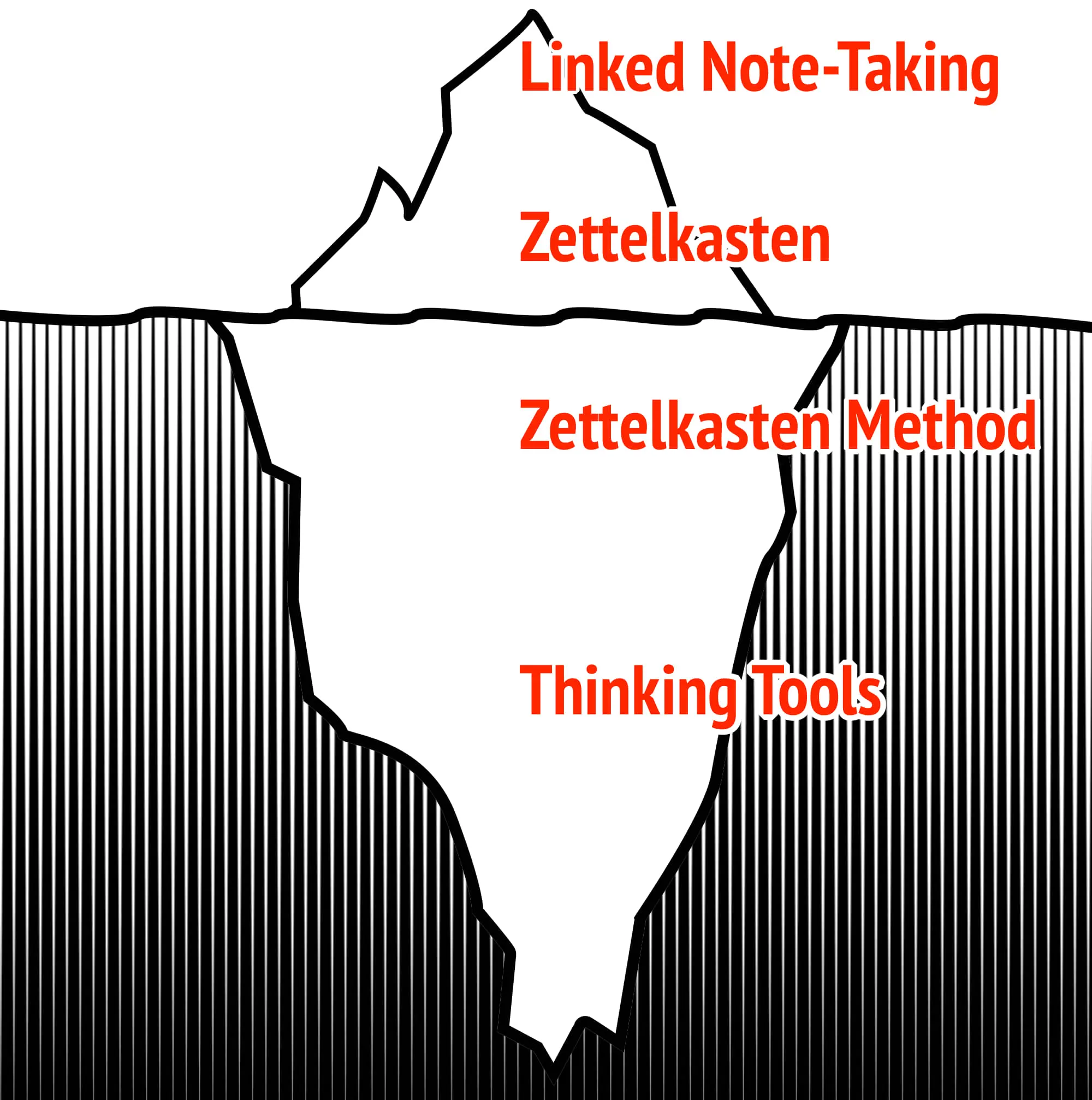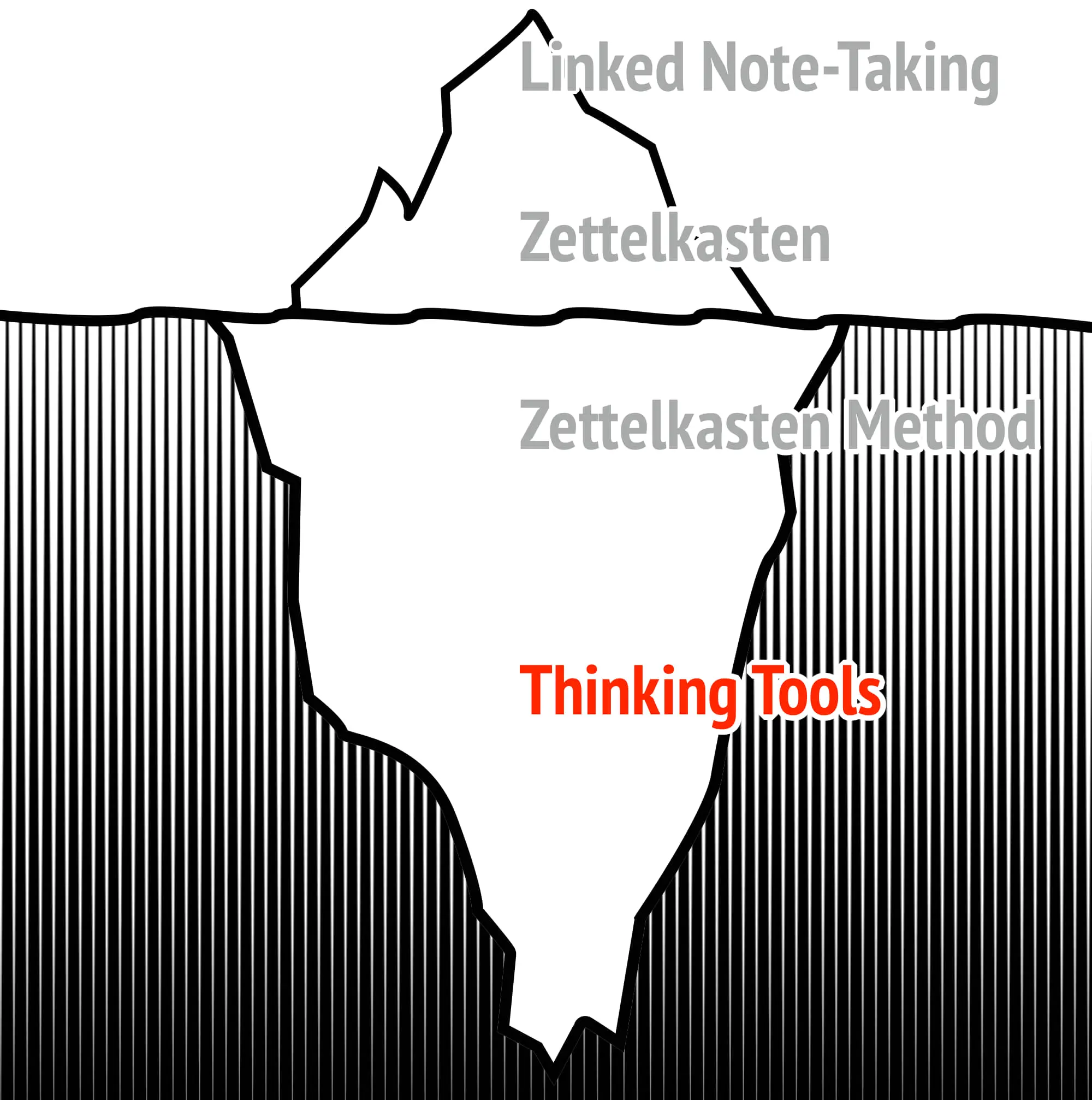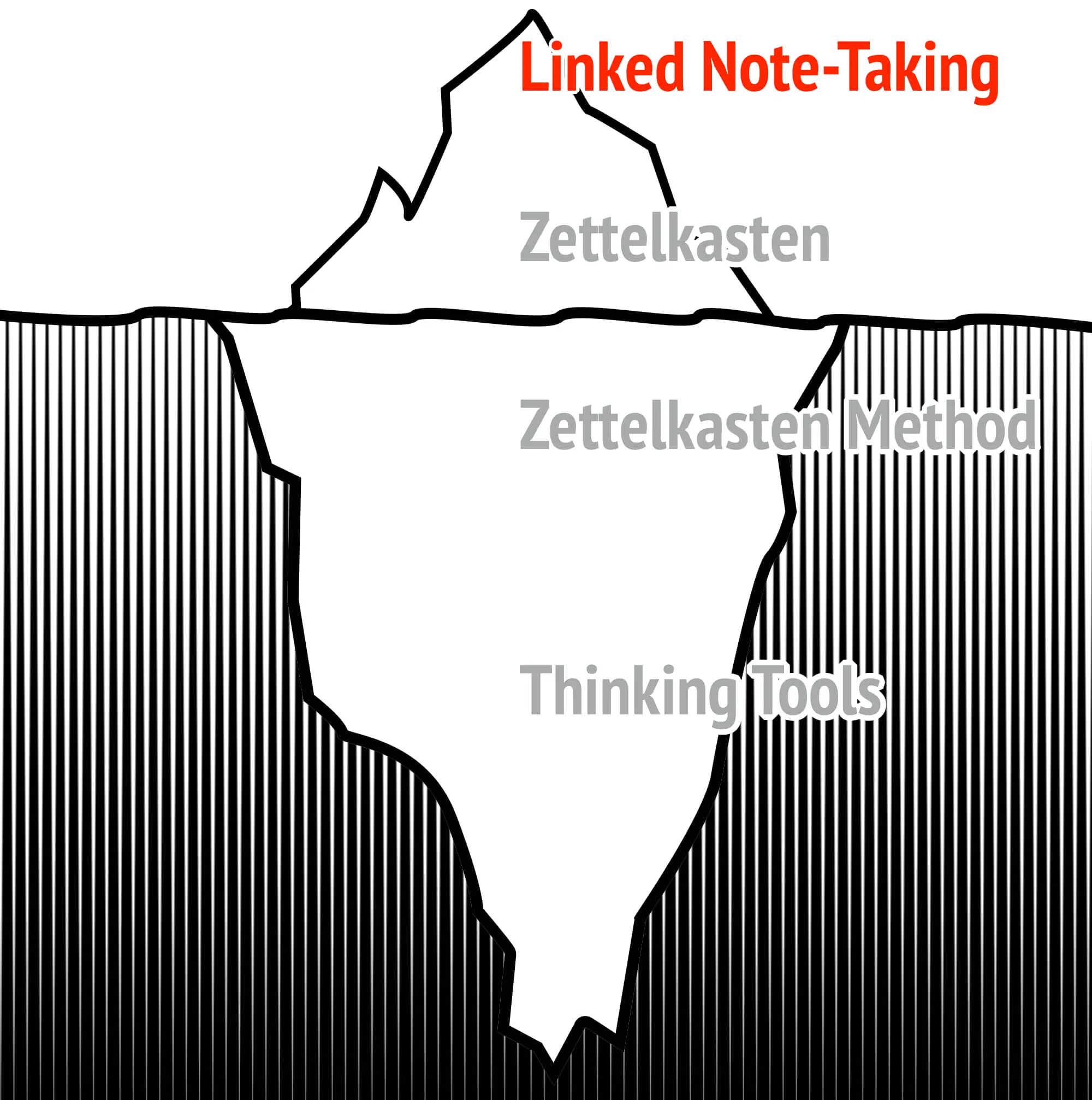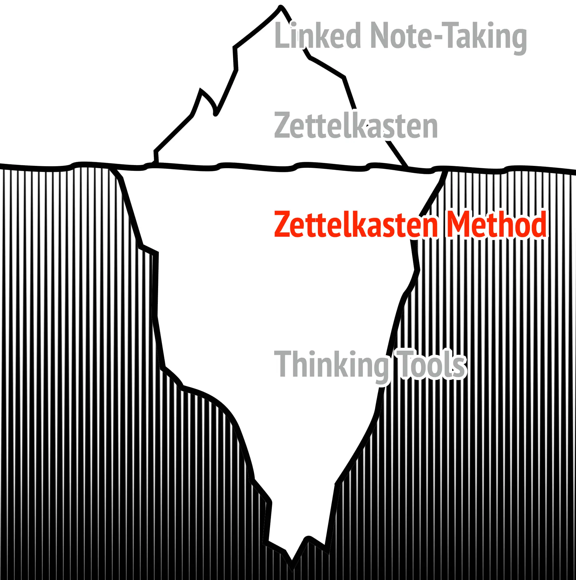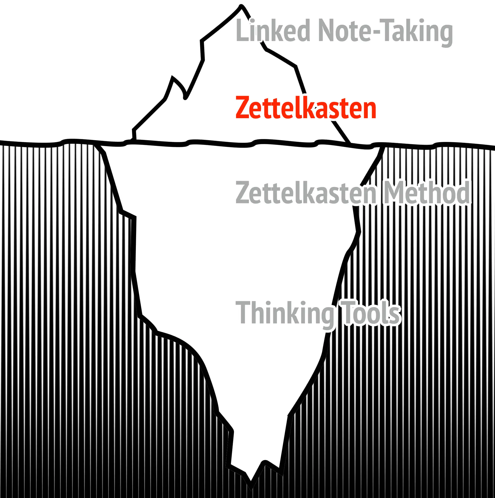We will use the Zettelkasten Iceberg to provide you with a progressively deeper understanding of this principle. We will start by completing a surface-level understanding that addresses merely a way of note-taking and arrive at the deepest level, the nature of knowledge and thinking itself.